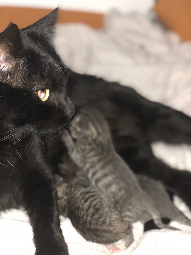 This is Annie. This very sweet kitty was rescued a few weeks ago in Anaheim. She gave birth this morning to three healthy kittens, two grey tabbies and a silver and black tabby. Welcome to the world, kittens, and congratulations, mama. We look forward to you growing in safety and to finding all of you forever homes.